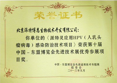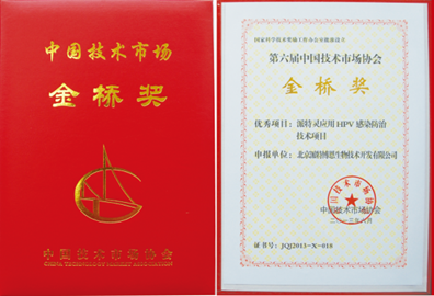 2013年,“派特靈應用HPV感染防治技術項目”榮獲第六屆金橋獎優(yōu)秀項目獎。