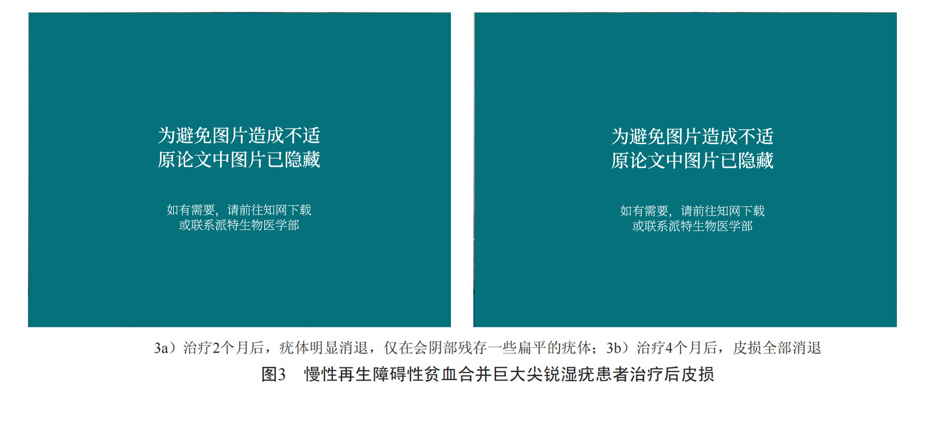 本例是一慢性再生障礙性貧血患者,由于長(zhǎng)期使用免疫抑制劑,成為 HPV 易感人群,發(fā)生了外陰肛周部 GCA。由于患者血小板偏低,疣體又過(guò)于巨大,為確?;颊叩闹委煱踩?,采用中藥派特靈治療,經(jīng)過(guò) 2 個(gè)月的治療患者疣體明顯消退,4 個(gè)月后皮損全部消退。治療效果滿意。
