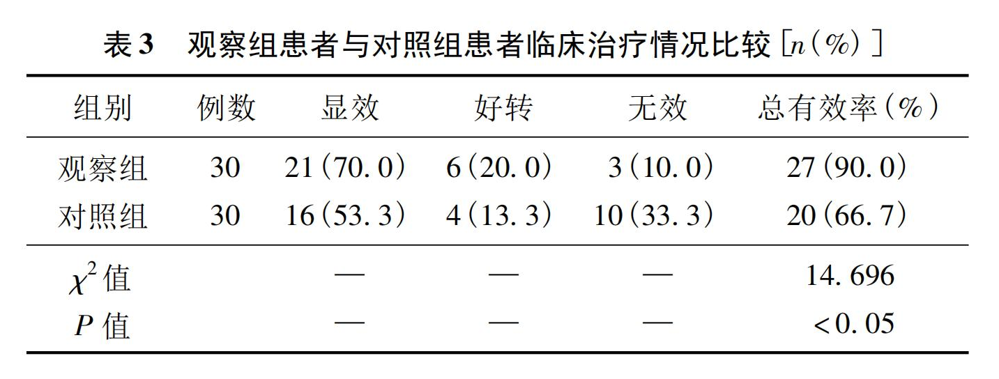 治療后對療效予以隨訪與評估,可以發(fā)現(xiàn)觀察組患者顯效21例,有效6例,總有效率為90.0%,與對照組患者的66.7%比較,差異具有統(tǒng)計學(xué)意義(P<0.05)。