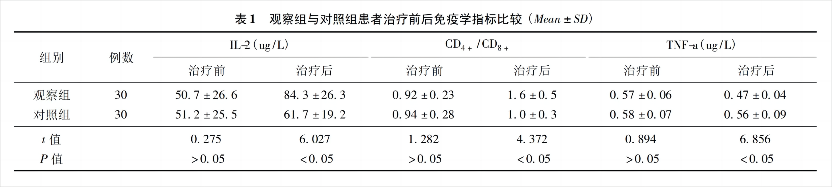 觀察組患者治療后白細(xì)胞介素2(IL-2)、腫瘤壞死因子(TNF-a)以及CD4+/CD8+免疫學(xué)指標(biāo)均得到顯著改善,與對照組比較差異具有統(tǒng)計學(xué)意義(P<0.05);