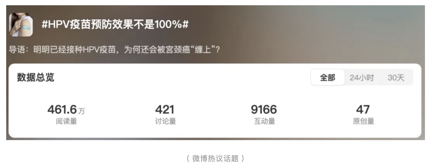 最近,微博上的一條熱搜引起了大家的關(guān)注——“HPV疫苗預(yù)防效果不是100%?”。截止截稿,該話題已被400萬人瀏覽、討論。